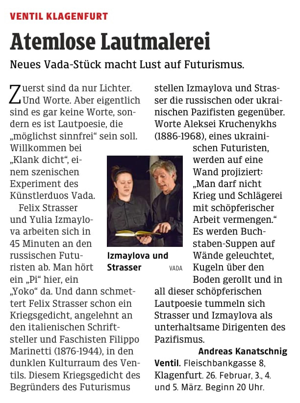 Die sowjetischen Futurist*innen erforschten und forderten einen völlig neuen Zugang zur Kunst und vertraten dabei eine kompromisslos konsequente Antikriegshaltung. – Bestrebungen, die auch heute von zentraler Bedeutung sind. Daher revitalisiert VADA die Ansätze der Avantgardist*innen und beschreitet künstlerische Wege jenseits der Unterhaltung.